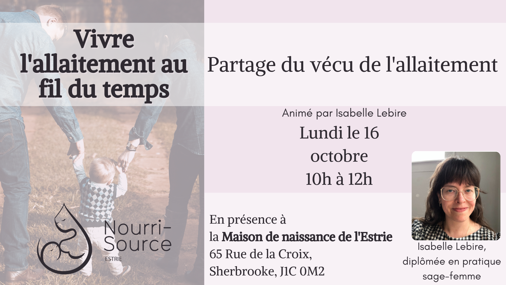 Venez partager dans un lieu sécuritaire votre vécu d’allaitement, passé ou présent, ou vos appréhensions face à un allaitement futur. Écoute, compassion et entraide. Partage guidé par Isabelle Lebire, formée comme sage-femme, et mère de trois enfants.