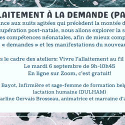 Allaitement à la demande Atelier fait par Ingrid Bayot, infirmière et sage-femme de formation Belge et diplômée en lactation humaine (DULHAM) et coanimé par Charline Gervais Brousseau, animatrice et marraine […]