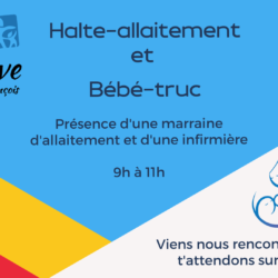 Halte-allaitement et Bébé-truc Venez rencontrer une marraine d’allaitement, une infirmière et d’autres familles. On vous y attend!