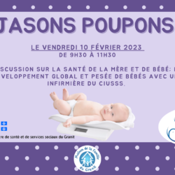 Venez rencontrer une marraine d’allaitement et une infirmière du CIUSSSS qui prendra le temps de répondre à vos questions sur la grossesse et le développement de votre bébé en plus […]