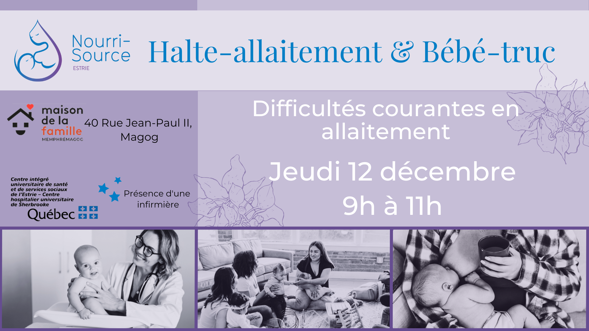 Thème: Introduction des solides Viens rencontrer une marraine d’allaitement et une infirmière qui prendront le temps de répondre à tes questions sur l’allaitement. Elles pourront regarder, avec toi, ton allaitement sans jugement et avec bienveillance. En plus, c’est l’endroit idéal pour rencontrer d’autres familles.